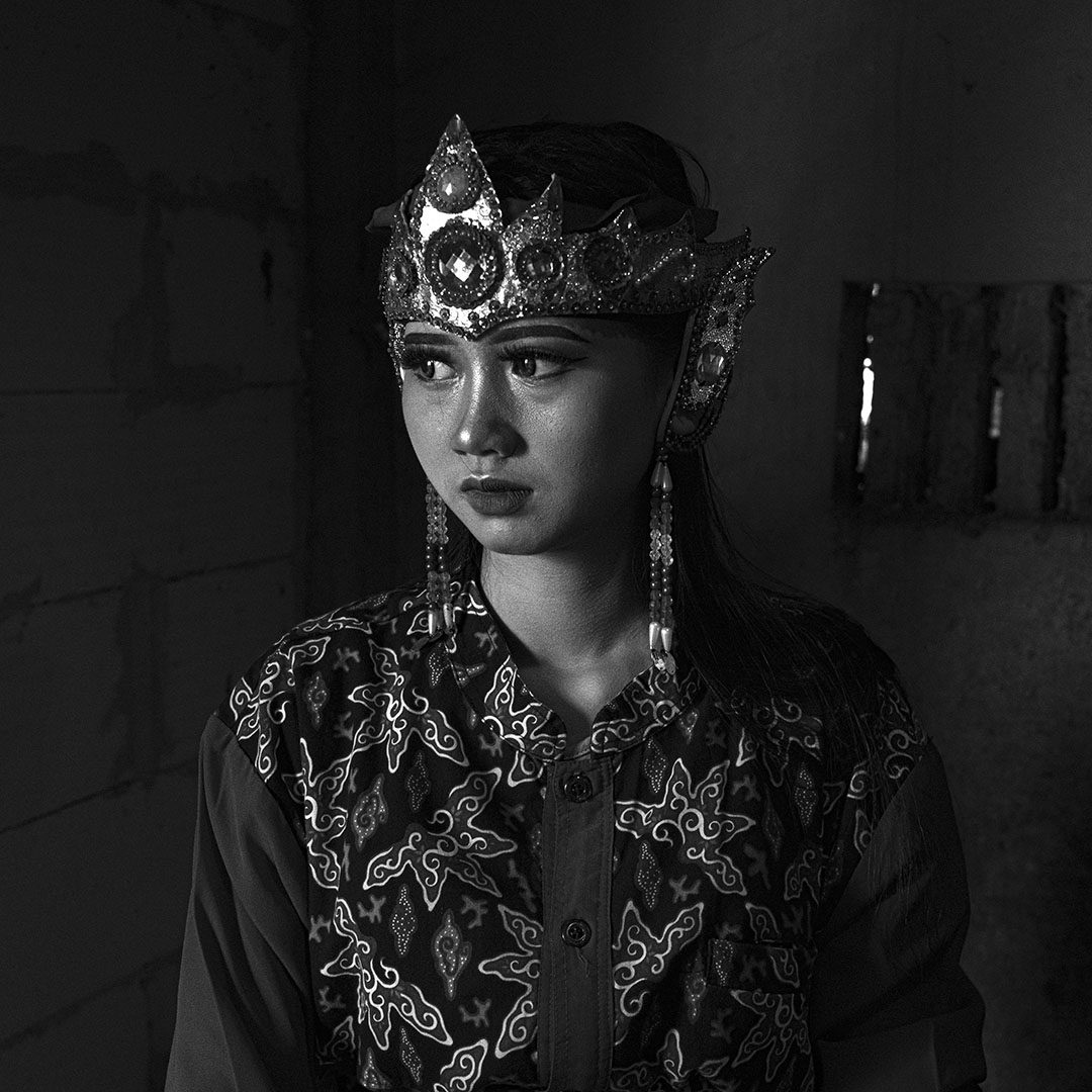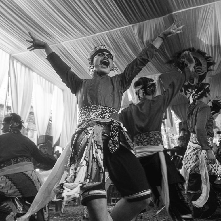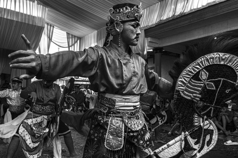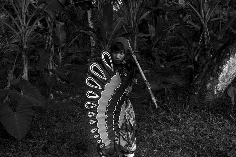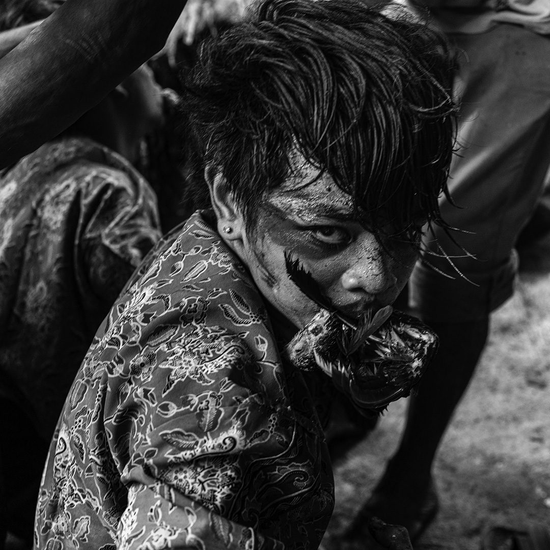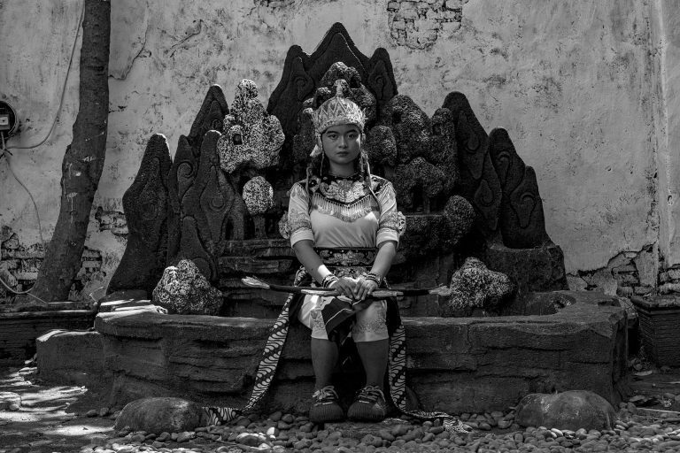 Le traitement visuel repose sur un travail approfondi de l’ombre, du clair-obscur et de la texture. La richesse chromatique de l’environnement culturel de Java devient un “outil de révélation”. Il me permet de sculpter les noirs et les blancs avec précision et intention, et de rendre perceptibles la tension, la poussière, l’effort, la fatigue et la charge rituelle qui traversent les scènes. J’alterne images prises sur le vif et portraits posés pour rendre compte de la fierté avec laquelle ces jeunes assument leurs rôles, leurs costumes et leur héritage.