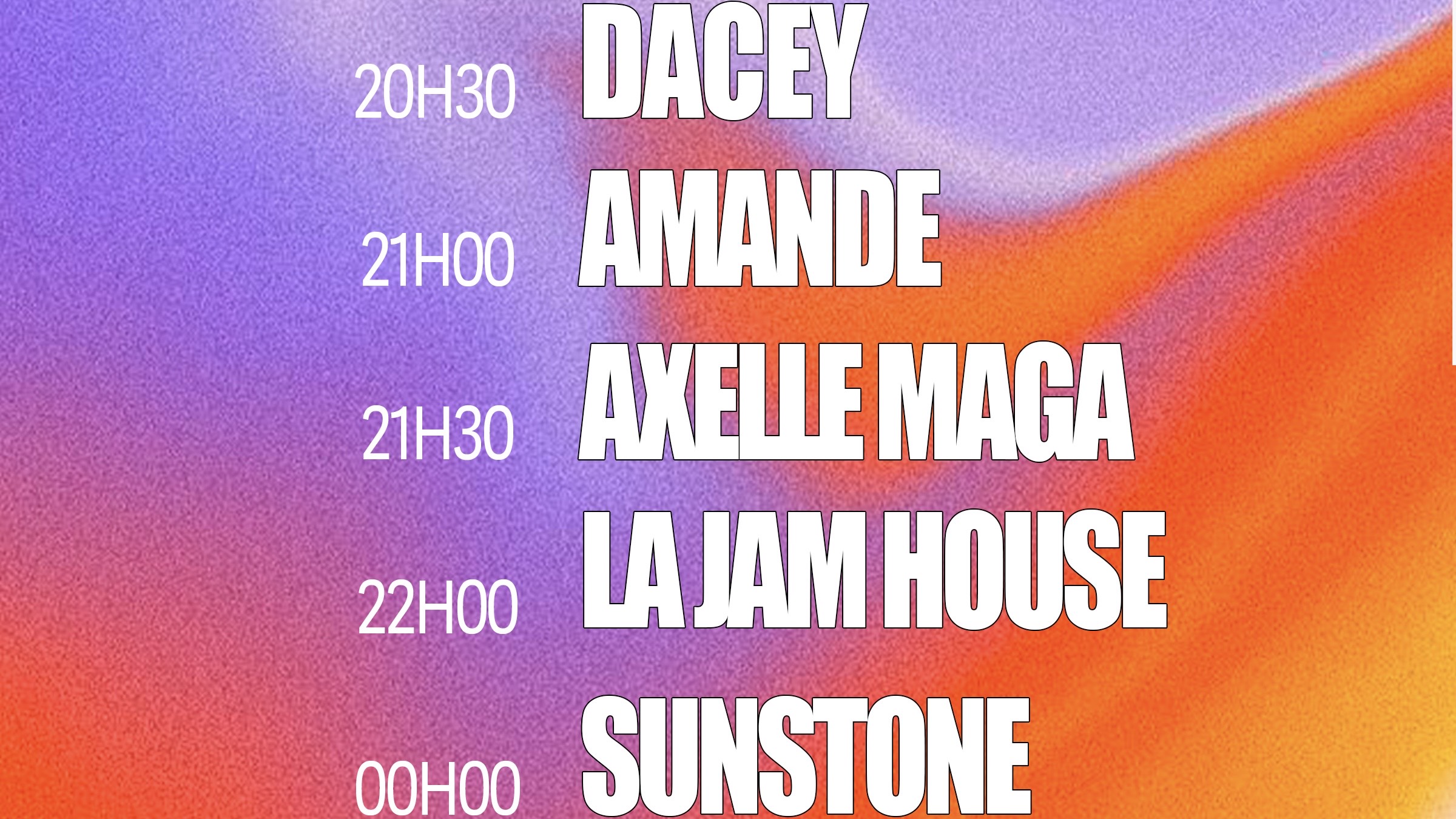 Soirée Jam House Venez profiter d’une soirée aussi douce que Groovy aux côtés de l’artiste Amande accompagnés de ses amies Dacey, Axelle Maga, La Jam House et Sunstone! 🌞 Entre rnb, house et techno, venez celebrer la musique 🎶 📅 Quand? : vendredi 24 mai 2024 🕑 De 19h à minuit |
